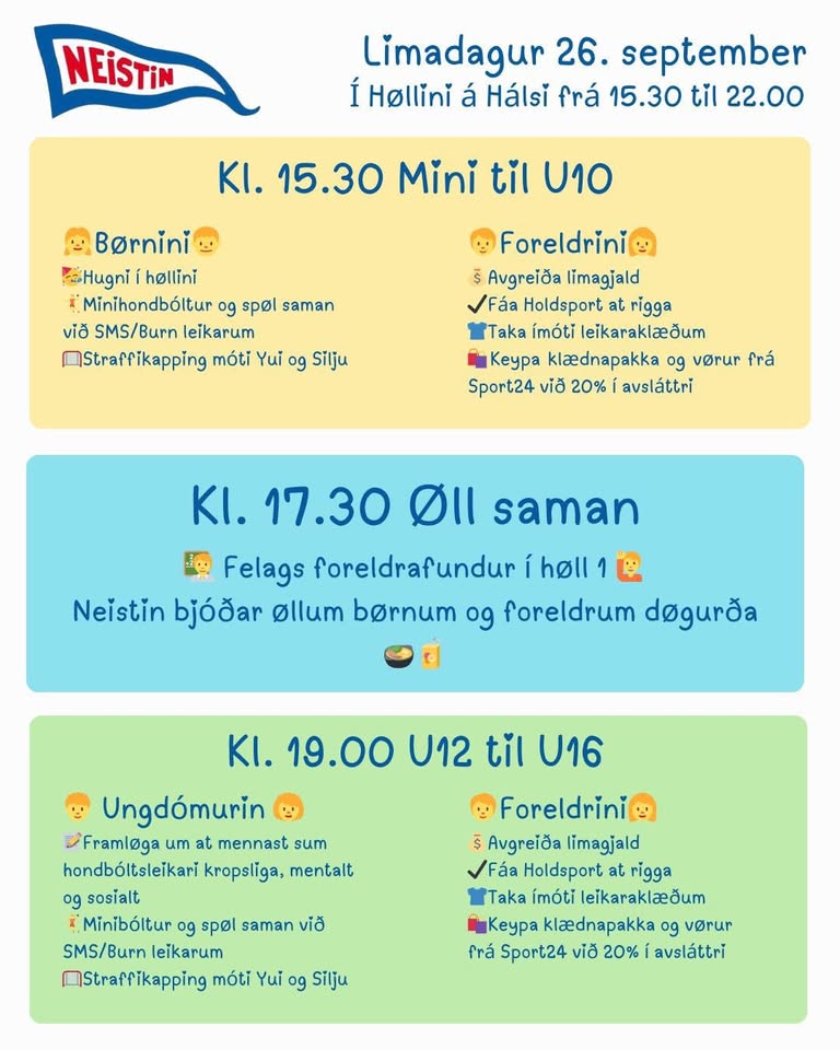 Tey yngstu møta frá 15.30 til 19, meðan tey eldru møta frá 17.30 til 22.00 – saman við foreldrum og systkjum, sjálvandi.